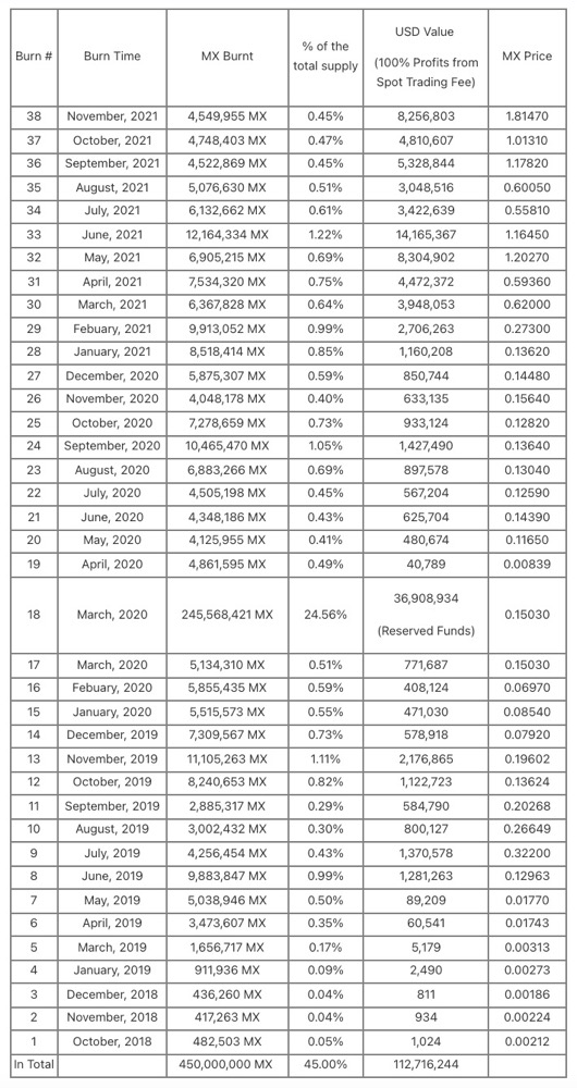 MX 바이백 & 소각 표(Buyback and Burn Table)